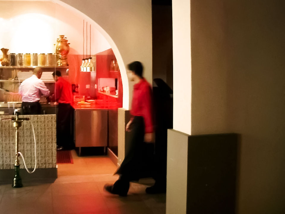 Islamic-style archways define the space, creating three distinct areas. To the right, the open kitchen invites diners into the culinary experience, while an intimate bar on the left offers a warm, atmospheric retreat. At the heart of the restaurant, the main dining area is enriched with recessed niches displaying curated Middle Eastern artifacts, blending authenticity with modern sophistication.